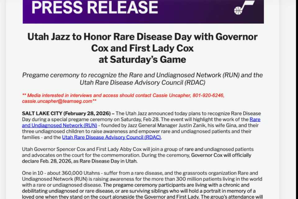 Utah Governor Spencer Cox and First Lady Abby Cox will join a group of rare and undiagnosed patients and advocates on the court for the commemoration. During the ceremony, Governor Cox will officially declare Feb. 28, 2026, as Rare Disease Day in Utah.