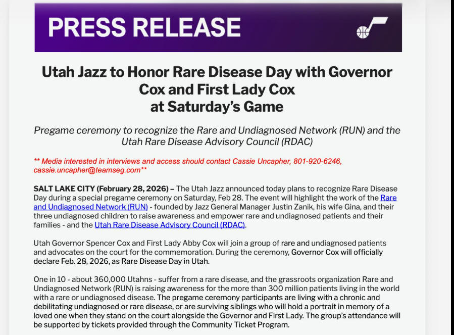 SALT LAKE CITY (February 28, 2026) – The Utah Jazz announced today plans to recognize Rare Disease Day during a special pregame ceremony on Saturday, Feb 28. The event will highlight the work of the Rare and Undiagnosed Network (RUN) – founded by Jazz General Manager Justin Zanik, his wife Gina, and their three undiagnosed children to raise awareness and empower rare and undiagnosed patients and their families – and the Utah Rare Disease Advisory Council (RDAC).